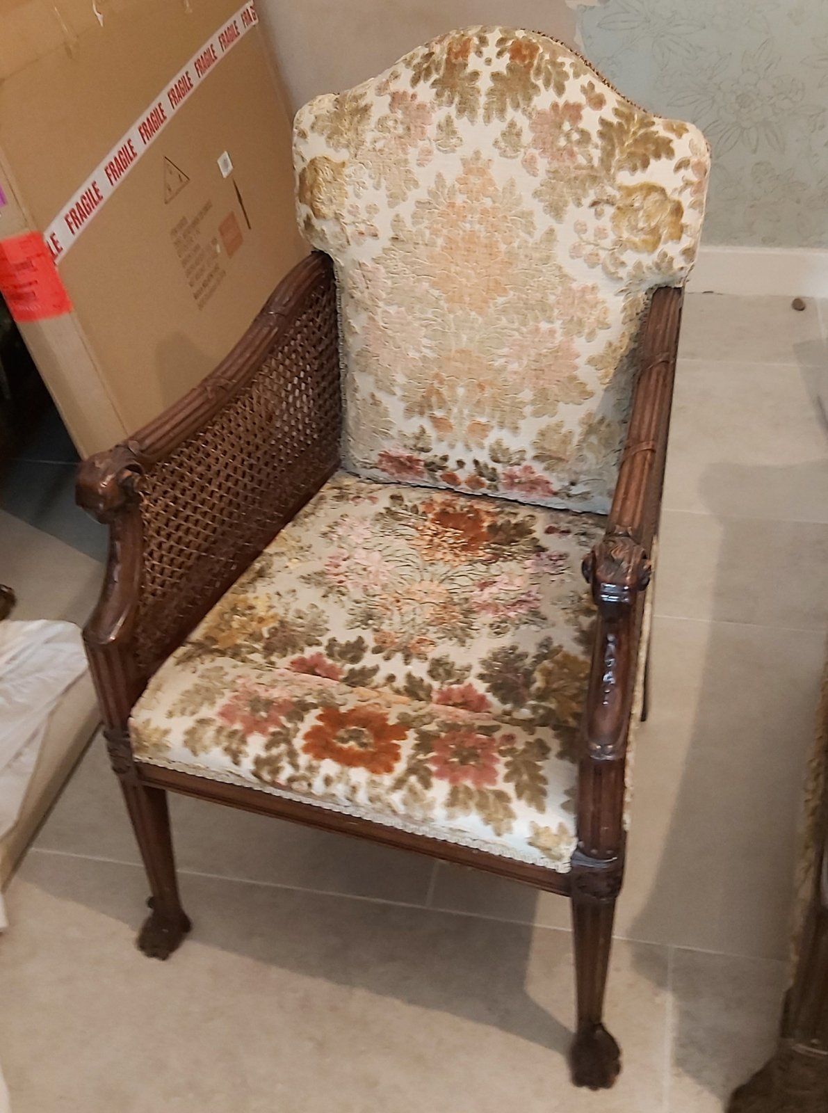 Firstly, we stripped the old fabric and stuffing off the site, then cleaned and re-waxed the frame. It was then sent to our upholsterer to work his magic. In parallel, a new fireplace was being fitted, new wallpaper hung, and new curtains made.
