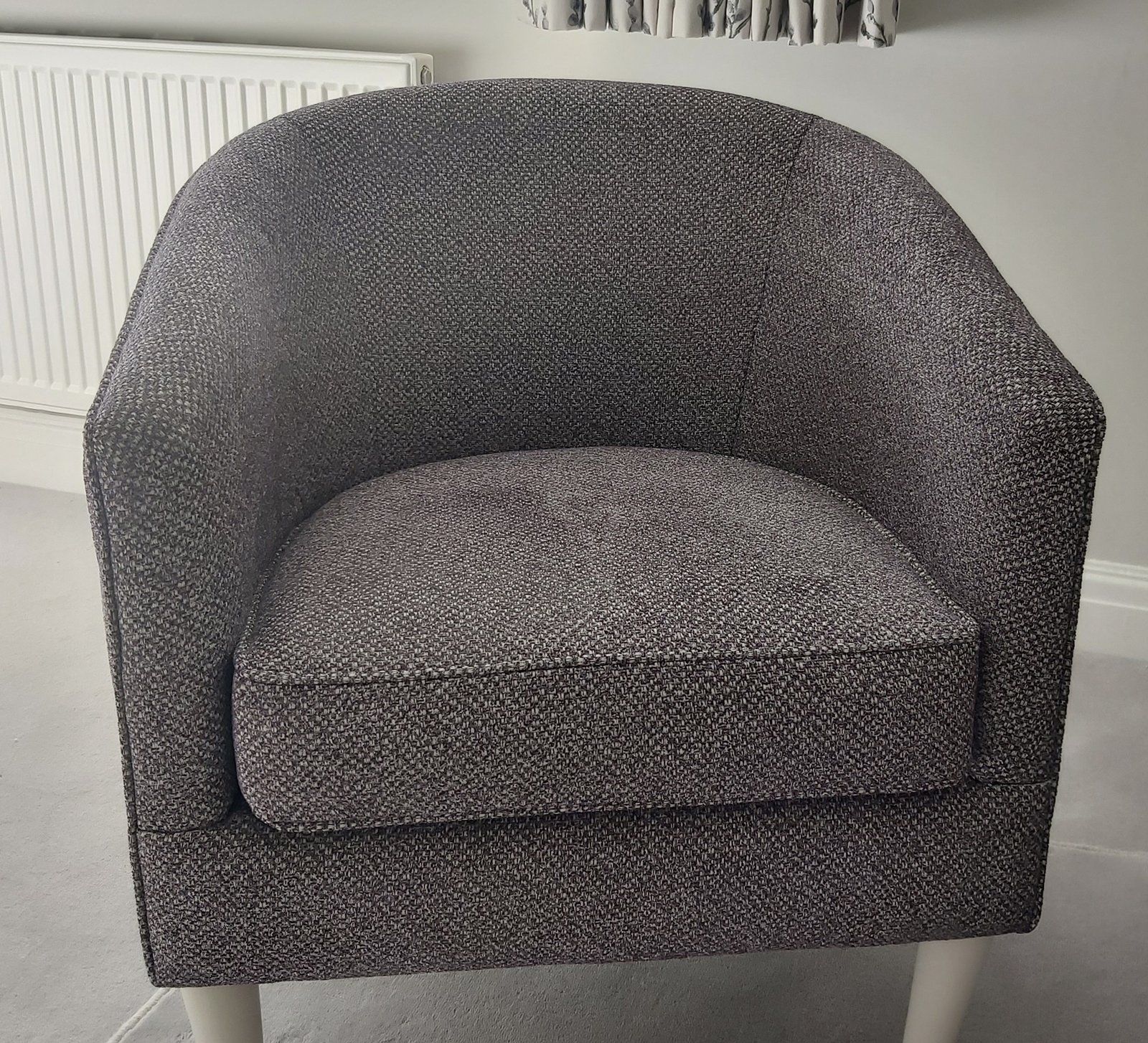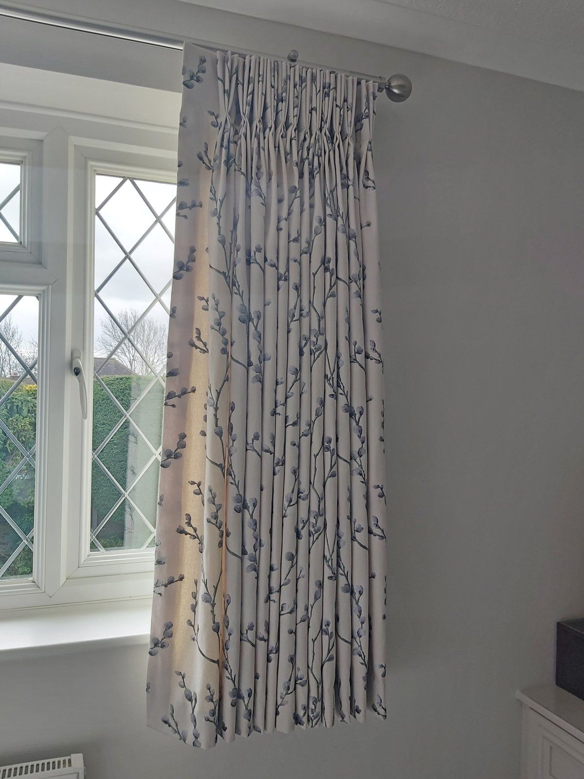 Our local carpet supplier installed the carpet, and we delivered the chair, cushions, and fitted the new curtain pole and curtains.